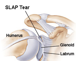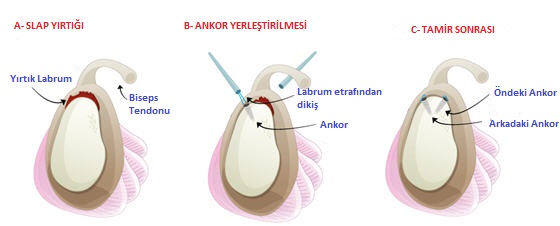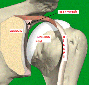 SLAP, superior labrum anterior- posterior sözcüklerinden oluşur. Yani kabaca labrumun üst tarafında önden arkaya doğru olan defekt anlamı taşır. Bu bölge aynı zamanda biseps tendonunun (pazı kasının omuz eklemi içinden geçen kirişi – not: pazı kasının omuz bölgesinde 2 adet kirişi vardır bunlardan uzun olanı glenoidin üst tarafına yapışır) uzun başının yapışma yeridir. Dolayısıyla SLAP lezyonunda biseps de etkilenmiştir. SLAP lezyonunun başlangıç evresinde bölgenin debridmanı ve kanlandırılması ile iyileşme sağlanabilirken ileri aşamalarında ayrılmış olan labrum ve bisepsin yerine dikilmesi gerekir. Bu işlem omuz artroskopisi ile başarılı bir şekilde gerçekleştirilir.